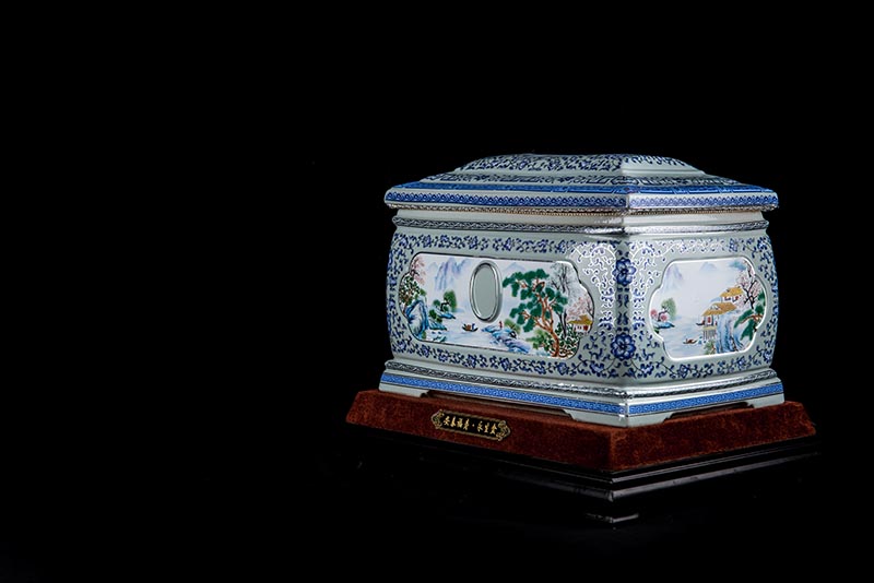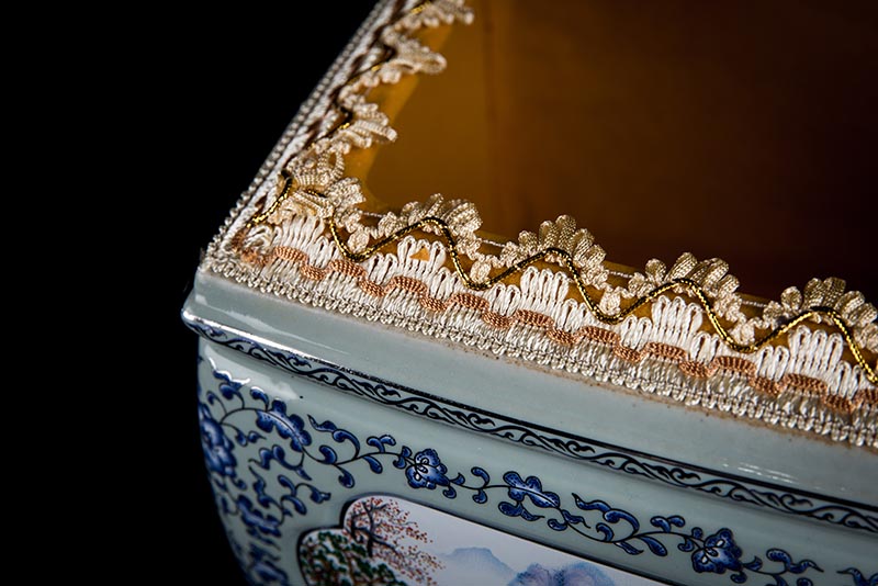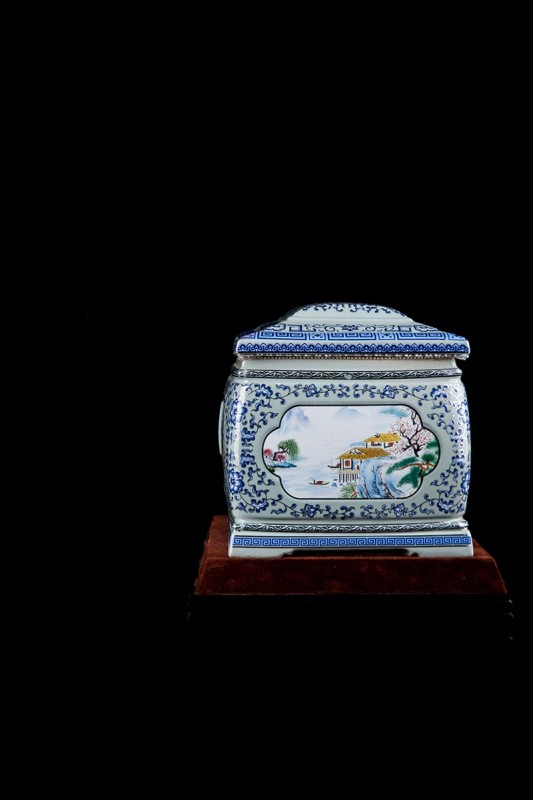 這款產(chǎn)品采用了青花粉彩工藝,既有景德鎮(zhèn)具特色的青花,又有山水,景德鎮(zhèn)民間稱之為“開窗山水”很多工藝品都會(huì)運(yùn)用上,讓許多文人墨客忍不住注目觀看。我們可以看到這款產(chǎn)品圖片上青花與山水搭配巧妙,纏枝蓮紋環(huán)環(huán)相扣,寓意后世枝繁葉茂,代代繁榮。尺寸:340x230x250mm